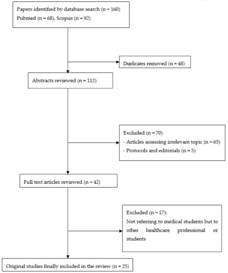 The initial search was conducted in the PUBMED and Scopus databases and the last search was performed on 1 September 2020. The following key words and their combinations were used for the search: antimicrobial stewardship*, medical students*, knowledge*, attitudes*, perceptions*. Duplicate publications were identified and removed.
