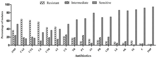 Antibiotic susceptibility pattern of extended-spectrum β-lactamases (ESBL) producing bacterial strains used in this study. Note 1: AMP, ampicillin; CAZ, ceftazidime; CTX, cefotaxime; CZ, cefazolin; CTR, ceftriaxone; AT, aztreonam; CX, cefoxitin; TR, trimethoprim; P/T-piperacillin/tazobactam, PB, polymyxin B; CIP, ciprofloxacin; A/S, ampicillin/sulbactam; LE, levofloxacin; AK, amikacin; TE, tetracycline; C, chloramphenicol; IPM-imipenem. Note 2: “Resistant”—Bacteria which could resist the effect of prescribed dosage concentration of antibiotic. “Intermediate”—Bacteria on its course to be resistant to prescribed concentration of antibiotic. “Sensitive”—Bacteria, which could not resist the prescribed dosage concentration of antibiotic.