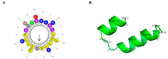 Peptides were synthesized using the solid-phase-9-fluorenylmethocycarbonyl1 (F-moc) method on a Rink amide-4-methylbenzhydrylamine resin and a Liberty microwave peptide synthesizer (CEM Co., Matthews, NC, USA). Hydroxybenzotriazole (0.1 M) dissolved in piperidine and dimethylformamide and 0.45 M 2-(1H-benzotriazole-1-yil)-1,1,3,3-tetramethyluroniunm hexafluorophosphate dissolved in dimethylformamide were used as linkage reagents. After washing with dichloromethane, cleavage was performed in a solution of trifluoroacetic acid, phenol, water, and triisopropylsilane for 2 h at 25 °C. The crude peptides were diluted with ice-cold ether for precipitation. The peptides were added to tubes and then completely dried. The dried peptides were diluted in distilled water and then purified by RP-HPLC on a Jupiter C18 column (4.6 × 250 mm, 300 Å, 5 μm; Phenomenex, Torrance, CA, USA). The molecular weights of the peptides were confirmed by MALDI-TOF MS (Kratos Analytical, Inc., Chestnut Ridge, NY, USA). Projections of the predicted three-dimensional structures were confirmed using PEP-FOLD3 (https://bioserv.rpbs.univ-paris-diderot.fr/services/PEP-FOLD3/). PEP-FOLD3 can be used for structural characterization of the peptides, followed by visualization using PyMOL [48,49]. The HeliQuest site (http://heliquest.ipmc.cnrs.fr) was used to generate helical wheel diagrams.