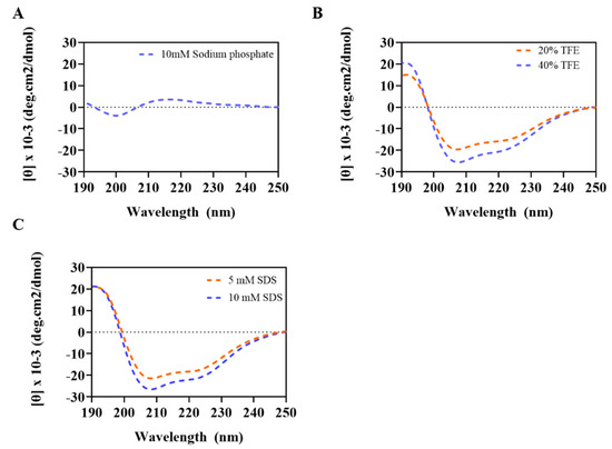 The CD spectra of Css54 at 40 μM were obtained in different buffers consisting of 10 mM sodium phosphate, 5 and 10 mM sodium dodecyl sulfate (SDS), and 20% and 40% 2,2,2-trifluoroethanol (TFE). CD spectra were measured using a Jasco 810 spectropolarimeter (Jasco, Tokyo, Japan) with a quartz cuvette (1.0-mm path length). The CD spectra were measured at wavelengths of 190–250 nm [52].