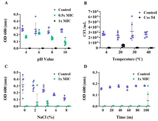 To assess the antimicrobial activity of Css54 under various L. monocytogenes growth conditions, Css54 was tested by MIC assay at pH values of 4, 6, 8, and 10, temperatures of 4–40 °C, and salt concentrations of 0–8%. At different pH values, Css54 at 0.5× and 1× MIC inhibited the growth of L. monocytogenes compared to the control (Figure 4A). Moreover, Css54 showed antimicrobial activity at various temperatures (Figure 4B). In the salt sensitivity test, the antimicrobial activity of Css54 was maintained in the presence of different salt concentrations (Figure 4C). Moreover, Css54 retained its antimicrobial activity after heating at 100 °C for 80 min (Figure 4D). These results suggest that the antimicrobial activity of Css54 can be maintained under the growth conditions of L. monocytogenes and showed thermal stability for 80 min.