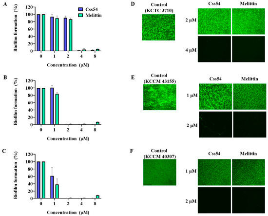 Listeria monocytogenes can attach to many food surfaces and form biofilms [23]. Therefore, the inhibition of biofilm formation by L. monocytogenes strains by Css54 was assessed. The antibiofilm activities of Css54 and melittin were compared. Melittin is known to have antibiofilm activity [24,25]. Css54 and melittin (both at 4 μM) inhibited biofilm formation by L. monocytogenes (KCTC 3710) by more than 50% (Figure 5A). For the strains L. monocytogenes (KCCM 43155) and L. monocytogenes (KCCM 40307), Css54 and melittin at 2 μM inhibited biofilm formation by more than 50% (Figure 5B,C).