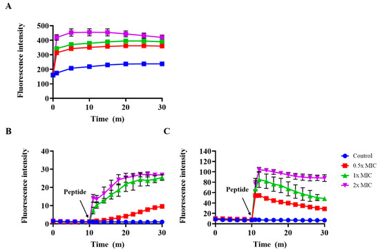 Listeria monocytogenes (KCTC 3710) and Salmonella typhimurium (ATCC 14028) were cultured in BHI and MHB media, respectively. The bacteria were washed three times with 10 mM Sp buffer (pH 7.2). The bacteria were resuspended to a final concentration of 2 × 107 CFU/mL in 10 mM Sp buffer. The bacteria were incubated with 1 μM SYTOX Green for 15 min in a black 96-well plate. Css54 and melittin at 0.5×, 1×, and 2× MIC were added to the mixture. The fluorescence intensity was measured at excitation and emission wavelengths of 485 and 520 nm, respectively [54].