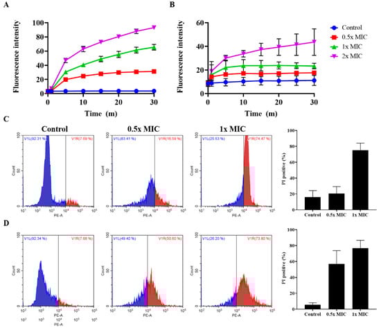Analysis of L. monocytogenes and S. typhimurium membrane integrity after treatment with Css54. Css54 at 0.5×, 1×, and 2× MIC were added to (A) S. typhimurium and (B) L. monocytogenes. Fluorescence intensity of SYTOX green was measured at emission and excitation wavelengths of 520 and 485 nm, respectively. Flow cytometry analysis using propidium iodide staining against bacterial membrane integrity. Changes in (C) S. typhimurium and (D) L. monocytogenes after treatment with peptide at 0.5× and 1× MIC for 10 min were measured by flow cytometry using propidium iodide (PI).