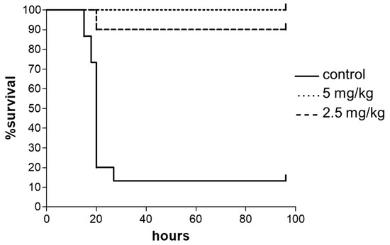 CD-1 mice were treated i.v. with SET-M33D 30, 25, or 20 mg/kg in a single dose (Figure 7), and were monitored for 4 days. No signs of toxicity were observed at 20 and 25 mg/kg in any animal. At 30 mg/kg, SET-M33D caused 10% mortality after 24 h. All the mild signs of toxicity recorded immediately after inoculation disappeared in live animals within 24 h. No significant variation in body weight was detected (not shown).