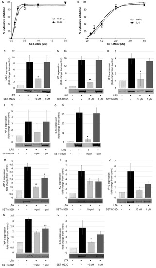 Effect of SET-M33D on protein release or gene expression of proinflammatory cytokines. (A,B) ELISA measurement of TNF-α and IL-6 produced by RAW264.7 cells after stimulation with LPS from P. aeruginosa (20 ng/mL) or LTA from S. aureus (2 µg/mL) in the presence of different concentration of SET-M33D. Data is expressed as percentage inhibition of cytokines with respect to LPS or LTA values (100%). Values are the mean ± SD of five independent experiments (n = 5). IC50s are reported in the text. (C–L) Gene expression of proinflammatory cytokines MIP1, KC, IP10, TNF-α, and IL-6 was analyzed by RT-PCR. RAW264.7 cells were stimulated with LPS from E. coli (C–G) or with LTA from S. aureus (H–L) in presence of SET-M33D at 10 or 1 µM. Densitometric analysis of cDNA bands (pictures under the columns) was carried out using ImageJ software. The reduction of cDNA is indicated as fold change with respect to control ± SD of two independent experiments (n = 2). * p < 0.05, ** p < 0.01 calculated using Student’s t-test with GraphPad Prism.