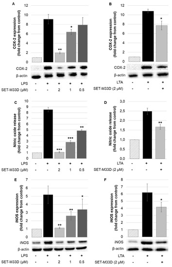 To examine whether inhibition by SET-M33D could be attributed to its modulation of iNOS protein expression, Western blot analysis was carried out. A certain amount of iNOS protein was produced under LPS and LTA stimulation and it was reduced by SET-M33D in a concentration-dependent manner. SET-M33D (2 µM) reduced iNOS expression, restoring expression to basal level when cells were stimulated with LPS (Figure 4E), and inhibiting protein expression by about 32.6% (± 3.7) when cells were stimulated with LTA (Figure 4F).