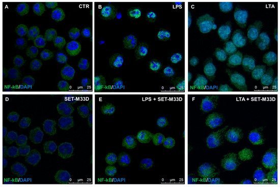 NF-kB/p65, a member of the NF-kB protein family, is transferred to the nucleus in response to stimulation with LPS or LTA. NF-kB/p65 translocations into macrophages were analyzed by immunofluorescence after LPS or LTA stimulation and SET-M33D treatment. NF-kB/p65 was located in the cytoplasm in the control group (Figure 5A, sharp green signal), while in LPS- or LTA-stimulated cells, it translocated to the nucleus (Figure 5B,C), as shown by merging of colors. Treatment with SET-M33D clearly restored the NF-kB/p65 to the cytoplasm (Figure 5E,F). SET-M33D alone did not produce any change in NF-kB/p65 translocation (Figure 5D).