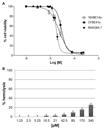 Cytotoxic and hemolytic effect of SET-M33D in vitro. RAW 264.7, 16HBE14o-, and CFBE41o- cells (A) were incubated with increasing concentrations of SET-M33D for 48 h. Cell viability is expressed as a percentage with respect to untreated cells ± SD. The experiment was performed twice in triplicate; n = 6. (B) Hemolytic activity of SET-M33D is reported as a percentage ± SD of red blood cell hemolysis after incubation for 24 h at 37 °C.