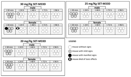Acute in vivo toxicity of SET-M33D at 30, 25, and 20 mg/kg, given in a single dose. Ten mice/group (each circle represents a mouse), five males and five females, were inoculated i.v. with SET-M33D and were monitored for 96 h. Different scales of grey indicate severity of signs as described in the legend.