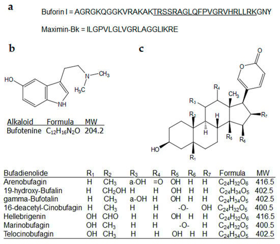 Chemical structures of antimicrobial molecules isolated from Bufonidae. (a) Primary structure of peptides; the underlined sequence in Buforin I represents the primary structure of buforin II. (b) Alkaloid. (c) Bufadienolides. MW: Molecular weight (g/mol).