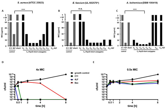 Storck, P.; Umstätter, F.; Wohlfart, S.; Domhan, C.; Kleist, C.; Werner, J.; Brandenburg, K.; Zimmermann, S.; Haberkorn, U.; Mier, W.; et al. Fatty Acid Conjugation Leads to Length-Dependent Antimicrobial Activity of a Synthetic Antibacterial Peptide (Pep19-4LF). Antibiotics 2020, 9, 844. https://doi.org/10.3390/antibiotics9120844