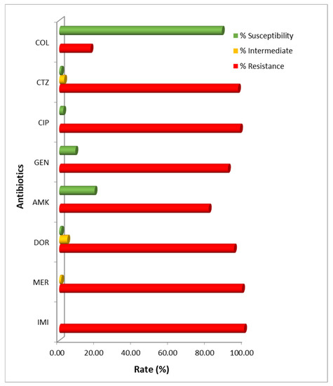 - Ibrahim, M.E. Prevalence of Acinetobacter baumannii in Saudi Arabia: Risk factors, antimicrobial resistance patterns and mechanisms of carbapenem resistance. Ann. Clin. Microbiol. Antimicrob. 2019, 18, 1. [Google Scholar] [CrossRef]