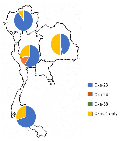Geographical distribution of oxacillinase (OXA)-type carbapenemase-encoding genes present in carbapenem-resistant A. baumannii isolates from across Thailand.