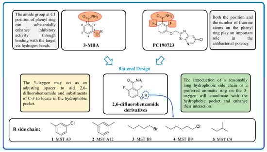 Previously our group has sought to further probe whether new 2,6-difluorobenzamide derivatives with other non-heterocyclic modifications to the 3-alkyloxy side chain could lead to increased antibacterial activity, broader spectrum of activity and improved on-target potency [23,24]. It was hypothesized that retaining the amide and 2,6-difluoro functions but introducing a series of small hydrophobic side chains such as substituted benzyl, alkyl halides, or a branched alkyl would enhance interactions with the hydrophobic pocket in the interdomain cleft of FtsZ. The design strategy to chemically optimize novel 2,6-difluorobenzamide derivatives is shown in Figure 1. Compounds, including representative MST compounds (1–5) showed encouraging antibacterial activity against the standard strains of S. aureus and B. subtilis [23,24].
