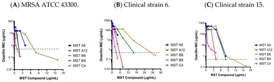 The MST compounds synergize with oxacillin to restore sensitivity in methicillin resistant Staphylococcus aureus. The MIC of MRSA ATCC 43300 and 16 clinical MRSA strains were determined in the presence of varying concentrations of the MST compounds. Results for the MRSA ATCC strain (A) and two representative clinical isolates (B,C) are shown with the graphs of all other clinical MRSA strains provided in Supplementary Figure S1. The MIC of MSSA ATCC 25923 for oxacillin (0.5 µg/mL) is indicated as a dotted grey line.