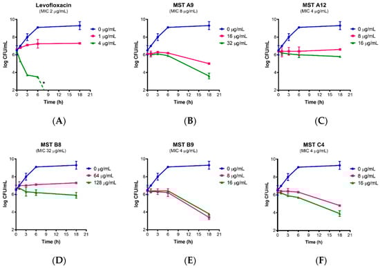 Time-kill curves for MST compounds. Viable cell counts were performed for (A) MRSA in the absence of any levofloxacin (blue line) and in the presence of levofloxacin at bacteriostatic (1 µg/mL) and bactericidal (4 µg/mL) concentrations; (B–F) in the presence of no compound (blue line), 2× MIC of the compounds (pink line) and 4× MIC of the compounds (green line). The results are representative of three independent experiments performed with different batches of cells and are presented as mean log CFU/mL ± SEM. The asterisk (*) represents viable cell counts below 1 × 103 CFU/mL.