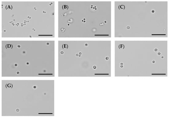 To confirm that the antibacterial mechanism of the MST compounds was through the disruption of cellular division, microscopic analysis was performed. The morphology of MRSA ATCC 43300 treated with MST compounds at 2× and 4× their MIC values was observed using light microscopy at various time points (summarized in Figure 4 at 6 h treatment and expanded in Supplementary Figure S1). Bacteria treated with the known cell disruptor divin produced the ballooning phenotype that is characteristic of cocci that have enlarged but are unable to undergo division (Figure 4A vs. Figure 4B). The MST compounds induced the same enlarged phenotype for S. aureus within 3 h of exposure for the bactericidal compounds MST A9 (1), B9 (4) and C4 (5), which preceded the reduction in cell viability observed in the above time-kill study (Figure 3). The effect of 2× the MIC of MST compounds after 6 h of incubation are shown in Figure 4C–G. In the presence of the MST compounds, the S. aureus cells displayed a cell-division phenotype consistent with disrupted cell division, as evidenced by enlargement of or ballooning being observed (Figure 4 and Supplementary Figure S2) [34,36].