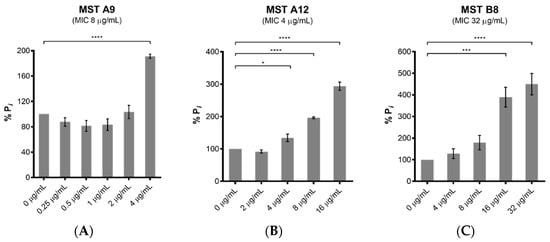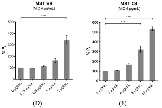Bacterial survival assays were conducted to determine whether MST compounds were bactericidal or bacteriostatic in their action. Levofloxacin served as a control as this antibiotic is bacteriostatic at 0.5× MIC, but bactericidal at higher concentrations (Figure 3A). MRSA was incubated with the MST compounds at either 2× or 4× their MIC and viable cell counts performed at various time points from which time-kill curves were plotted (Figure 3B–F). In all cases, cell numbers remained constant for the first 6 h of treatment. Compounds MST A9 (1), B9 (4) and C4 (5) reduced the viable cell count after 6 h consistent with bactericidal activity (up to 3 log reductions). In contrast, cell numbers remained constant throughout the time course for MST A12 (2) and MST B8 (3) suggesting bacteriostatic activity. Previous studies have reported that other benzamide derivatives are bactericidal in their mode of action [4,11,12,34,35,36].