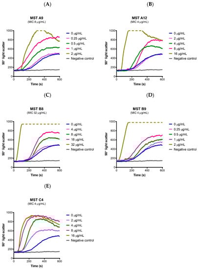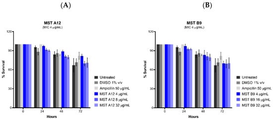 In vitro cytotoxicity was assessed in HepG2 (ATCC HB-8065) cells using the RealTime-GloTM MT Cell Viability Assay Kit (Promega) essentially as described previously [54]. The MST compounds were tested at 2×, 4× and 8× MIC using a final DMSO concentration of 1% (v/v) in the assay. Two controls, 1% (v/v) DMSO and 50 µg/mL ampicillin were used. The luminescence signal was read at 5-min intervals over 24 h in a Cytation5® plate reader (Bio-Tek®), at 37 °C in the presence of 5% CO2.