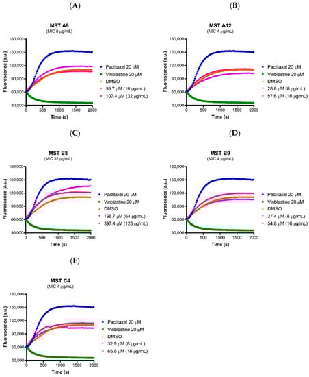 The MST compounds were tested at 2× MIC and 4× MIC. A final concentration of 2% (v/v) DMSO was maintained in the assay. Controls included 20 µM paclitaxel (promoter of polymerization), 20 µM vinblastine (inhibitor of polymerization) and 2% (v/v) DMSO (solvent control). The reaction was initiated by the addition of 1 mM GTP and the fluorescence was read for 2000 s using a PerkinElmer Enspire® plate reader.