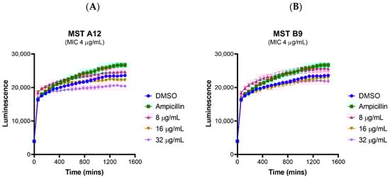 MST compounds are not cytotoxic to mammalian cells at concentrations of 2× MIC. Two compounds A12 (A) and B9 (B) are presented as examples to illustrate these effects. Real-time cell viability measurements for HepG2 after treatment with compounds at 2× (pink line), 4× (brown line) and 8× (purple line) MIC. Controls of 1% (v/v) DMSO (vehicle control, blue line) and 50 µg/mL ampicillin (green line) were used. Cell viability was measured every 5 min for 24 h at 37 °C and 5% CO2 on a Cytation5® Cell Imaging Multi-Mode Reader (Bio-Tek®) using the RealTime-GloTM MT Cell Viability Assay reagent. The results are presented as the mean ± SEM (SEM is presented at every hour).