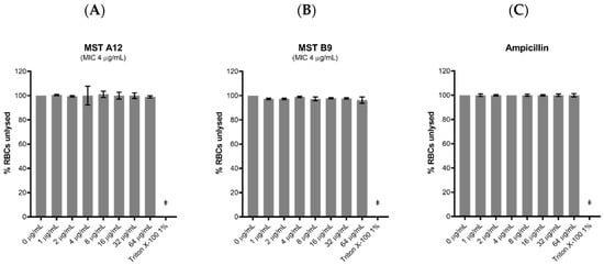 Haemolytic activity of the MST compounds against human RBCs showed that none of the compounds displayed any haemolytic activity at concentrations up to 64 µg/mL (Figure 9 and Figure S5), a concentration that exceeds the antimicrobial concentration of the MST compounds by 2- to 16-fold. Two compounds A12 (2) and B9 (4), and a positive control ampicillin are used as examples to illustrate these effects in Figure 9, and the expanded version showing the results for all compounds is provided in Supplementary Figure S5.