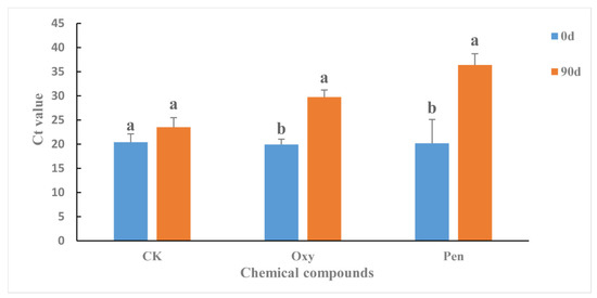 Ct value in HLB-affected citrus treated with oxytetracycline (Oxy) and penicillin (Pen). Different letters represented significantly differences at the level of 0.05 (p ≤ 0.05).