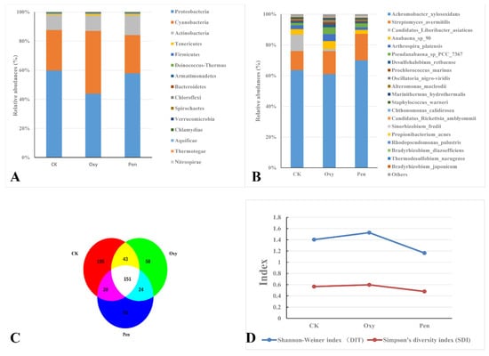 Bacterial species present after antibiotic treatments of HLB-affected citrus plants. Taxonomic abundance of microbial community at the (A) phyla and (B) species rank in HLB-affected citrus treated with oxytetracycline (Oxy) or penicillin (Pen). (C) Venn diagram representing bacterial species in the endophytic microbial community in HLB-affected citrus treated with tap water (CK), oxytetracycline (Oxy), or penicillin (Pen). (D). Simpson’s diversity index (SDI) and Shannon–Weiner index (DIT) of the endophytic microbial community in HLB-affected citrus treated with tap water (CK), oxytetracycline (Oxy), or penicillin (Pen).