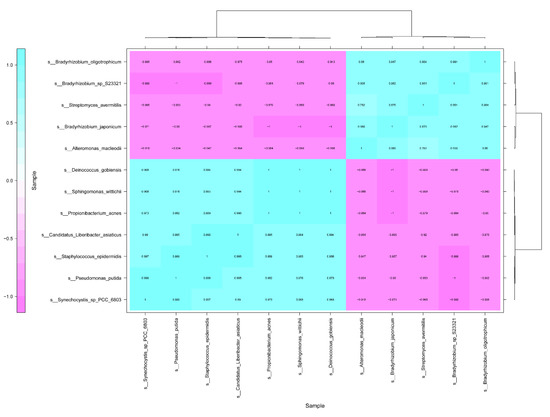 Under the antibiotics treatment, the correlation of CLas between the other 458 bacterial species was analyzed (Table S1). The results indicated that 11 bacterial species, relative abundance of which was more than 0.0001, had significantly correlated with CLas (1 > ∣R∣ > 0.9, p < 0.05). The bacterial species including Propionibacterium acnes, Pseudomonas putida, Synechocystis sp_PCC_6803, Sphingomonas wittichii, Staphylococcus epidermidis, and Deinococcus gobiensis, had positively correlated with CLas (Figure 3). On the other hand, five bacterial species such as Streptomyces avermitilis, Alteromonas macleodii, Bradyrhizobium japonicum, Bradyrhizobium sp S23321, and Bradyrhizobium oligotrophicum, showed negative correlation with CLas (Figure 3).