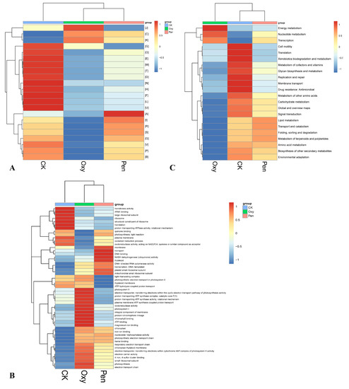 In total, 1296 genes were annotated against the GO database (Table 2). The relative abundance of chloroplast, chloroplast thylakoid membrane, photosynthesis, nucleoside-triphosphatase activity, iron ion binding, 4 iron, 4 sulfur cluster binding, electron carrier activity, electron transport chain, photosynthetic electron transport chain, heme binding, respiratory electron transport chain, electron transporter, transferring electrons within cytochrome b6/f complex of photosystem II activity, and small ribosomal subunit were increased by both Oxy and Pen treatment (Figure 4B). In the Pen treatment, the relative abundance of membrane, NADH dehydrogenase (ubiquinone) activity, transport, thylakoid, DNA binding, DNA-directed RNA polymerase activity, plastid small ribosomal subunit, mitochondrial small ribosomal subunit, and transcription, DNA-templated were the highest relative to that for CK and Oxy (Figure 4B).