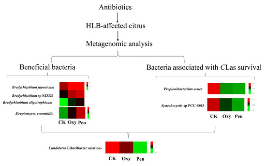 In this study, Pen displayed greater antibacterial activity against CLas than did Oxy (Figure 1). In addition, antibiotic treatment could change the microbial structure and function in HLB-affected citrus. Therefore, the alteration of CLas-associated microbiota may have contributed to the greater antibacterial activity of Pen.