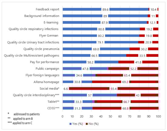 For complex interventions, process evaluations can be used to understand the functioning of the intervention by investigating uptake of intervention components, mechanisms of impact and contextual factors and to compliment high-quality outcome evaluations []. The process evaluation conducted alongside ARena aimed not only to assess whether program components were implemented as intended, and which were perceived to have impact, but also to thoroughly identify and analyze efforts for integration of components as well as determining organizational and individual factors of the appropriate antibiotics use within the ARena program. This present work aims to describe the identified individual and organizational factors affecting the uptake of this multi-faceted program and to offer indications referring to a potential implementation of tested components into routine care.