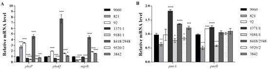 - Gunn, J.S. The Salmonella PmrAB regulon: Lipopolysaccharide modifications, antimicrobial peptide resistance and more. Trends Microbiol. 2008, 16, 284–290. [Google Scholar] [CrossRef] [PubMed]