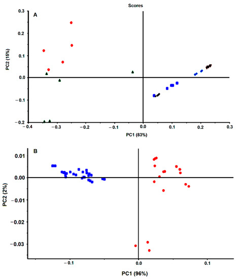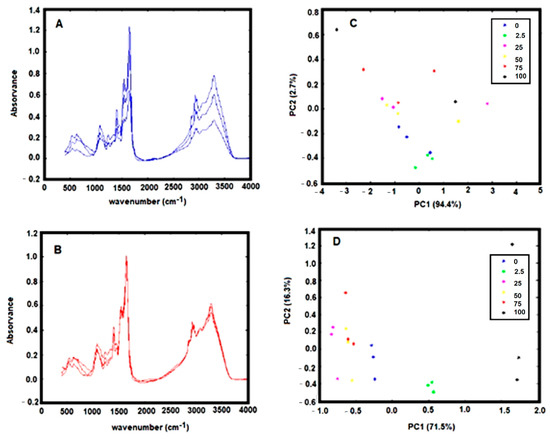 The spectra pre-processing was also optimized. The spectra baseline correction, which aims to minimize dissimilarity between spectra due to baseline deviation, was conducted by subtracting to the original spectra a constant value (i.e., by off-set correction). The FTIR spectra collected from the dry film can significantly be influenced by several physical effects such as light scattering originated from particles of different sizes and shapes or in homogeneities in the sample distributions [18]. To minimize these effects on spectral data, after the spectra off-set correction, a multiplicative scatters correction (MSC) and the first spectral derivative were applied. The effect of the pre-processing techniques was evaluated on triplicated experiments on the score-plot of a principal component analysis (PCA). It was observed that the application of MSC minimizes substantially the variance between spectra replicates, evidencing the strong contribution of physical distortions on the spectra (Figure 1A vs. Figure 1B). It is observed that after application of the MSC, data from experimental triplicates are close together in the PCA score plot (Figure 1C vs. Figure 1D). Indeed, the variance within replicates of PCA data decreased significantly after MSC application (Table 2).