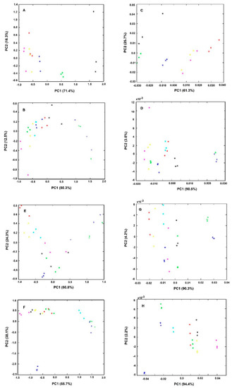 PCA of triplicates of bacteria spectra obtained from experiments as described in Table 1. All spectra were pre-processed by off-set and MSC correction. The graphs on the right (E–H) were further preprocessed by the first spectral derivative in relation to the respective left graphs (A–D). Legend of symbols: Blue—0 mg/L; Green—2.5 mg/L; Magenta—5 mg/L; Yellow—25 mg/L; Red—50 mg/L; Black—75 mg/L; Cyan—100 mg/L; Blue-cross—200 mg/L; Green (cross)—400 mg/L.