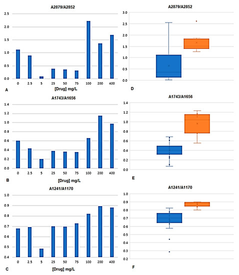 Peak ratios of bacteria spectra at A2879/A2852, A1743/A1656, and A1241/A1170. (A–C) Average values obtained along with diverse drugs concentration. (D–F) Box-plot graphs of peak ratios from drug concentrations lower to the MIC (blue boxes) and equal or higher to the MIC (orange boxes).