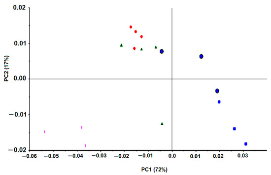 H. pylori J99 was submitted to clarithromycin, one of the most common antibiotics applied against H. pylori infection. This antibiotic MIC, against J99 H. pylori, was 15 mg/L. The PCA score-plot shown in Figure 7 represents quadruplicate experiments, where blue symbols correspond to bacteria incubations with a drug concentration below the MIC, the red symbols to the MIC, and the remaining colors (green and pink) to values above the MIC. Diverse data from replicated experiments were superimposed. All this reinforces that FTIR spectroscopy captured the effect of the concentration of the drug on the bacteria molecular profile in a reproducible mode and with high specificity and sensitivity.