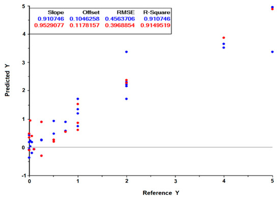 A drug screening assay based on the present method would be conducted on a reference H. pylori strain, and the effect of the drug on the cell’s metabolism would be monitored by its impact on spectral ratios (as presented in Table 3 and Table 4) or by PLS regression models valid for diverse drugs. For that, another PLS regression model was developed based on spectral data from both reference strains (26,695 and J99) tested against the two antimicrobials (the peptide-based drug and clarithromycin), that included: replicates of 10 different conditions with bacteria incubated with drugs concentrations that, in a conventional method, did not inhibit the bacteria growth; Replicates of 6 different conditions with bacteria incubated with drugs concentrations that, in a conventional method, inhibited the bacteria growth. With replicas, a total of 55 conditions were considered: n = 36 for the model building, i.e., model calibration, and an independent dataset of n = 19 for model validation. The PLS regression model, based on 7 latent variables, resulted in the validation data set on a 0.91 correlation coefficient and a root mean square error of 40% in relation to the MIC of the drug (Figure 8). Usually, a drug screening assay only needs to predict if the drug will limit bacteria growth. The possibility of the assay to predict the MICs (even with a high root mean square error of 40%) enables the prediction of the effect of the drug on the bacteria with the extra benefit of pointing to the drug’s MICs.