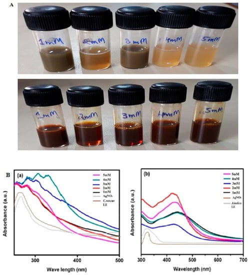 Ag NPs were synthesized from C. roseus (C Ag NPs) and A. indica (A Ag NPs) leaf extracts; the development of a brownish color was observed immediately after adding phytoextracts to 1 mM silver nitrate (AgNO3) due to the bioreduction of silver (Ag+) ions into silver nanoparticles (Ag NPs). Different concentrations (1to 5 mM) of AgNO3 with phytoextracts exhibited the appearance of a dark brown color, confirming the formation of Ag NPs, as shown in Figure 1A. The development of color was enhanced with time because of Ag+ reduction. During the synthesis of Ag NPs, due to the presence of biomass in the reaction mixture, the color changed from yellow-brown to darkish-brown. Here, biomass plays an essential role in the biosynthesis of Ag NPs. According to Mulvaney, the color change in the suspensions is due to the Ag NPs excitation of surface plasmonresonance vibrations [35]. Phytochemicals such as alkaloids, phenolic compounds, terpenoids, enzyme proteins, coenzymes, and sugars reduce metal (Ag) salts from a positive-oxidation state to a zero-oxidation state. The size and size distribution of metallic silver nanoparticles significantly depend on the biocompounds present in the extract. The presence of a strong reductantin the leaf extract enhances the bioreduction rate and favors the formation of smaller nanoparticles.