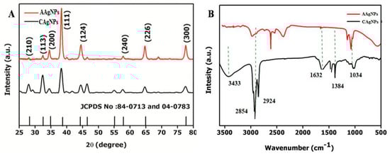 A conventional Fourier transform infrared (FTIR) approach was used to identify secondary metabolites involved in reducing and capping for the synthesis of Ag NPs. FTIR spectra were recorded by employing potassium bromide (KBr) disks using an FTIR spectrometer (Perkin Elmer, Spectrum 2) with a wavenumber of 4000 to 400 cm−1. The characteristic FTIR spectrum of green-synthesized Ag NPs, as depicted in Figure 2B, showed peaks at 3433, 2854, 2924, 1632, 1384, and 1034 cm−1. In this spectrum, a sharp absorption signal peak at 3433 cm−1 is related to the N–H bond of amine groups of green-synthesized Ag NPs and provides stabilization of Ag NPs. Hence, the occurrence of N–H group-specific proteins and enzymes correspond to the reduction of AgNO3 to Ag [32]. A comparative study of the FTIR spectrum ofthe control shows the most important signal peaks of ~3433, 1632, and 1384 cm−1, illustrating the N–H group’s presence on the surface of Ag NPs. According to Mishra et al., the cell-free extract might contain biomolecules such as peptides and proteins that affect the formation of Ag NPs through reduction [45].