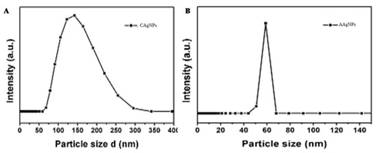The hydrodynamic size determination of green-synthesized Ag NPs of Catharanthus roseus (A) and Azadirachta indica (B) by dynamic light scattering (DLS).