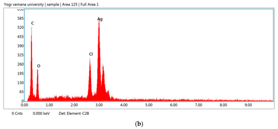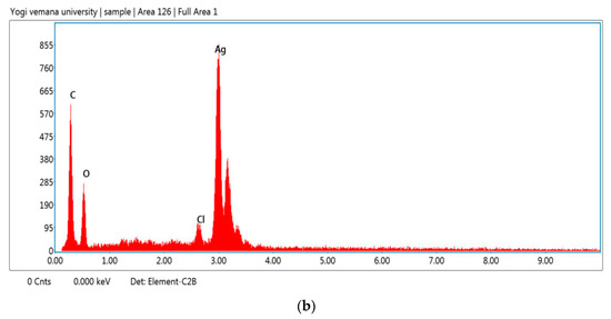 Analysis by the energy-dispersive X-ray (EDX) spectrum revealed that the incidence of silver elemental signals confirmed that the formed particles were Ag NPs through the bioreduction mechanism of leaf extracts with AgNO3. The y-axis represents the number of X-ray counts, and the x-axis represents energy in keV. The sharp elemental signal peaks showed the most significant emission energies for Ag, and these lines in the EDX spectrum confirmed that Ag had been properly recognized.