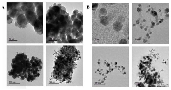 Transmission electron microscopy (TEM) images of biosynthesized silver nanoparticles from (A) Catharanthus roseus and (B) Azadirachta indica plant extracts.