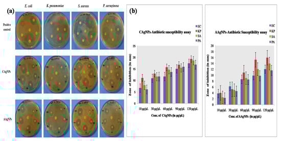 (a)Antibiotic susceptibility activity of biosynthesized silver nanoparticles (C Ag NPs and A Ag NPs) demonstrated by the disc diffusion method in multidrug-resistant (MDR) bacteria. (b) Graphical representation of antibiotic susceptibility activity of green-synthesized Ag NPs. EC—Escherichia coli, KP—Klebsiella pneumoniae, SA—Staphylococcus aureus, and PA—Pseudomonas aeruginosa.