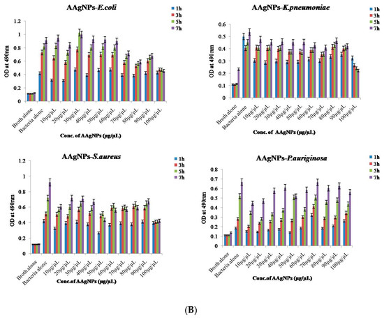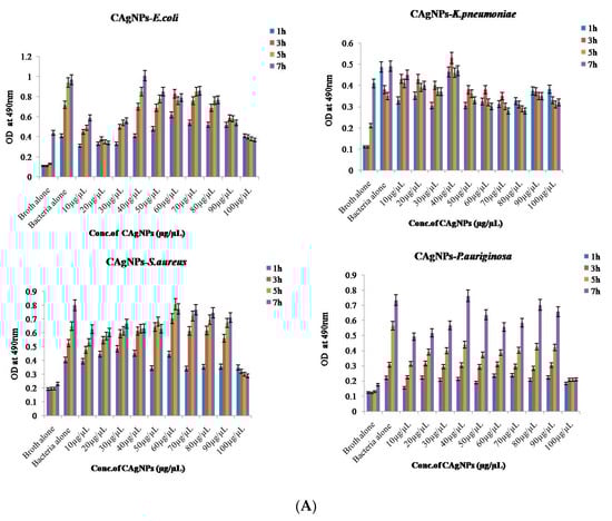 The bacterial growth inhibitory activity of C Ag NPs and A Ag NPs against MDR bacteria (E. coli, K. pneumoniae, S. aureus,and P. aeruginosa) at various time points (1, 3, 5, and 7 h of incubation) and concentrations (ranging from 10 to 100 µg/µL) were measured using a bacterial reduction assay. Interestingly, P. aeruginosa (80 µg/µL) required a higher amount of green-synthesized nanoparticles of C. roseus and A. indica to inhibit growth than the gram-positive bacteria S. aureus (10 µg/µL). For K. pneumoniae and E. coli, 10 µg/µL of synthesized nanoparticles was required for the inhibition of growth of MDR bacteria. The nanoparticles that were green-synthesized with different concentrations of A. indica and C. roseus were proven effective antibacterial agents against MDR bacteria. The results for C Ag NPs and A Ag NPs are represented in Figure 8A,B, respectively. The bacterial growth on MH-Agar (Mueller-Hinton agar) of E. coli and K. pneumoniae showed that lower concentrations of C Ag NPs (40–50 µg/µL) are optimum for inhibition. There is no significant inhibitory action obtained by increasing the concentration of C Ag NPs on MH-Agar for E. coli and K. pneumoniae. Therefore, 50 µL is the optimum/saturated concentration required for inhibitory action on S. aureus and P. Aeruginosa by C Ag NPs. No significant inhibitory action on bacterial growth was observedby increasing the dose volume of C Ag NPs. The tested species, especially S. aureus and P. aeruginosa, probably follow the dose-exclusion mechanism.However, at the highest concentration (100 µL), we found bacteriolytic activity in almost all strains. The exact mechanism of the inhibitory action of green-synthesized Ag NPs on bacterial growth is not known. The green-synthesized C Ag NPs and A Ag NPs showed significant bacteriolytic activity compared with several other plant extracts alone or silver nitrate alone. Yliniemi et al. demonstrated that the biosynthesized Ag NPs effectively cause cell death of MDR bacteria through various mechanisms of action on bacterial respiration and cell membrane permeability [51]. Rai et al. and other groups revealed that the smaller size of biosynthesized Ag NPs provides a large surface area, which ensures a more significant outcome compared with commercial silver (Ag) on bacteria [52,53,54]. Gurunathan et al. demonstrated the dose-dependent bactericidal activity of Ag NPs at concentrations ranging from 0.1 to 1.0 μg mL−1 against two gram-negative and two gram-positive bacterial strains. They showed that the antibacterial activity of Ag NPs at low concentrations was more effective against gram-negative bacteria than gram-positive bacteria. They found that cell viability was reduced, and no growth at MIC values was observed for both strains. Thus, the bactericidal effect depends on the concentration, and it is specific for each bacterial strain. Positively charged Ag NPs show bactericidal and bacteriostatic activity, as reviewed by Roy et al. (2019). They found that the antibacterial activity of Ag NPs at a 100 µg mL−1 concentration was slightly higher than that at 450 µg mL−1 compared to the control [55,56]. Our data demonstrated that although there was no dependence on concentration, at a higher concentration (100 µL), we observed bactericidal activity using a bacterial reduction assay.