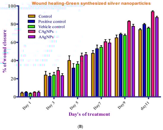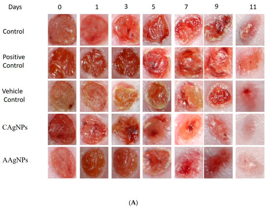 The wound-healing efficacy of C Ag NPs and A Ag NPs was evaluated using female BALB/c mice using an excision wound-healing model with 5 mm biopsy punches. The wounds were generated on the skin surface dorsally, nano-formulations were applied on alternate days (on days 1, 3, 5, 7, 9, 11), and pictures were taken. Povidone–iodine ointment that is available on the market was used as a positive control for treated mice. As depicted in Figure 9A, green-synthesized silver nanoparticles (C Ag NPs and A Ag NPs)-treated mice showed enhanced wound constriction efficacy when compared to control and positive-control groups. The wound beds where the green-synthesized Ag NPs were topically applied showed no microbial growth, hemorrhage, or formation of pus throughout treatment, while the control group wounds showed remarkable irritation. The green-synthesized silver-nanoparticles-treated animals showed better wound-healing capacity from day 1 onwards and decreased wound size throughout the remaining days of treatment when compared to control group animals. At the end of the study, the wounds exhibited approximately 94% ± 1% (p < 0.01) constriction after treatment with C Ag NPs and 87% ± 1% (p < 0.01) closure in the A Ag NPs group, whereas the control wound exhibited approximately 74% ± 1% closure and the positive control (povidone–iodine) and vehicle control (Vaseline) wounds showed 79% ± 1% and 76% ± 1% wound constriction, respectively (Figure 9B and Table 2).The decreased size of wounds and increased healing efficacy could possibly be explained by the green-synthesized Ag NPs microbial efficacy towards microbial infection surrounding the region of the wound. Mondal et al. demonstrated that tissue regeneration of damaged sites is well-recognized in wound healing experiments, and the outcomes were satisfactory in earlier studies of wound constriction [59].The C Ag NPs-treated group showed an improvement in whole wound appearance following decreased irritation, as shown by alleviated inflammation and negligible bruising on day 11 of the experiment. The experimental results revealed that the healing capacity of wounds treated with C. roseus silver nanoparticles was greater than that of A. indica silver nanoparticles.