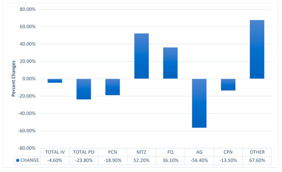 Utilizing days of therapy per 1000 patient days (DOT/1000 patient-days (PD)) for data across the three study sites, we found no change in administering antibiotics either IV (p = 0.67) or PO (p = 0.09). There was a significant decrease in use of penicillin (p = 0.02), aminoglycoside (p < 0.001), and cephalosporin (p = 0.04). Increases in DOT/1000 PD at post-intervention were significant for metronidazole (p < 0.001), quinolone (p = 0.01), and other antibiotics (p < 0.001) (Figure 1 and Table 2).