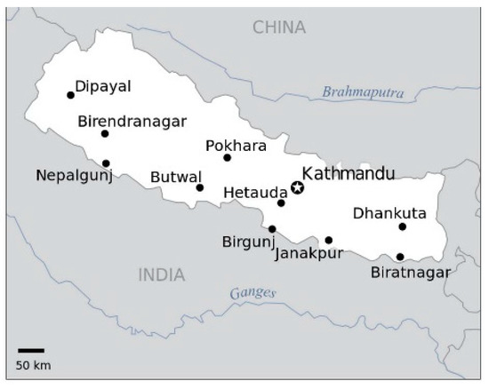 Map of major cities in Nepal.
