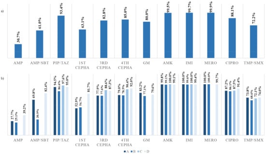 The pooled antimicrobial susceptibilities of (a) patients diagnosed with urinary tract infections (UTIs) in all four hospitals, and (b) in each of the four hospitals, A to D. AMP, ampicillin; AMP/SBT, ampicillin–sulbactam; PIP/TAZ, piperacillin–tazobactam; 1st CEPHA, 1st generation cephalosporin; 3rd CEPHA, 3rd generation cephalosporin; 4 CEPHA, 4 generation cephalosporin; GM, gentamicin; AMK, amikacin; IMI, imipenem; MERO, meropenem; CIPRO, ciprofloxacin; TMP/SMX, trimethoprim–sulfamethoxazole.